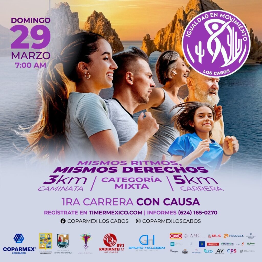 Los Cabos, Baja California Sur.– El próximo domingo 29 de marzo se llevará a cabo en La Marina de Cabo San Lucas la 1ª Carrera con Causa “Igualdad en Movimiento”, un evento deportivo que busca fomentar la participación ciudadana y apoyar al Instituto de las Mujeres del Municipio de Los Cabos.