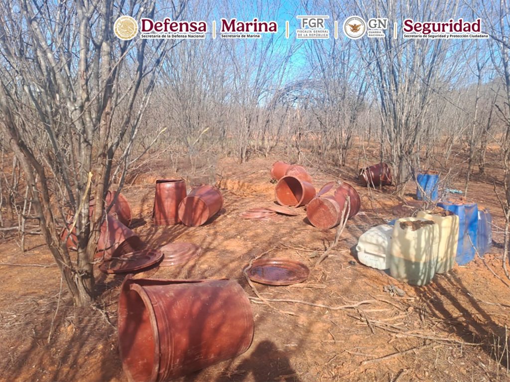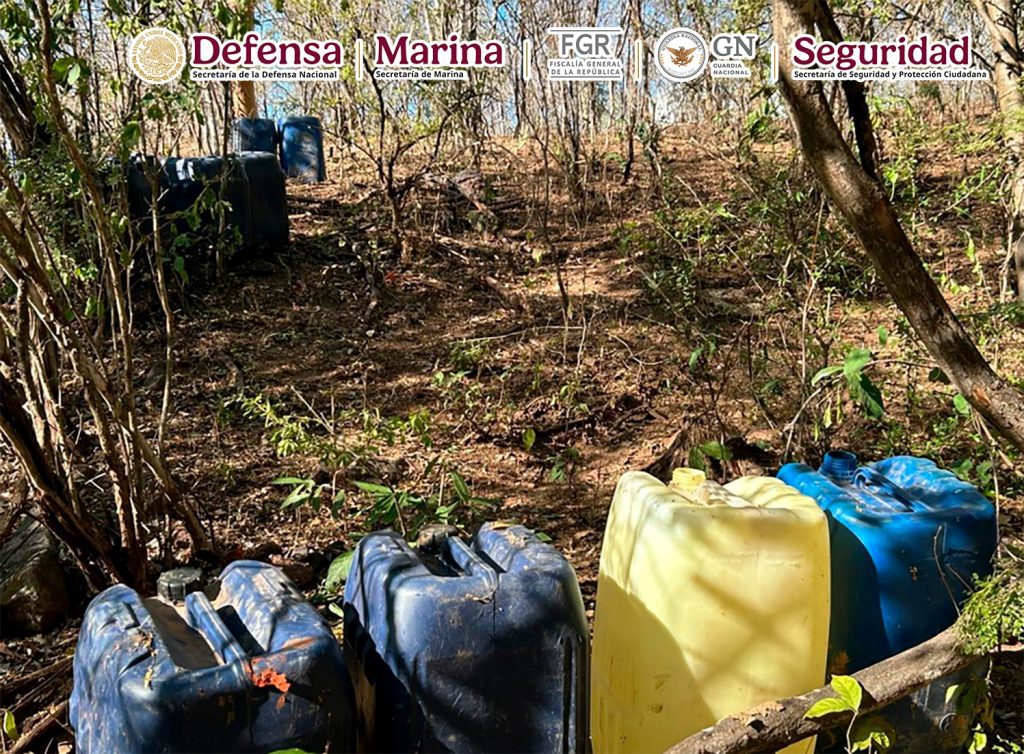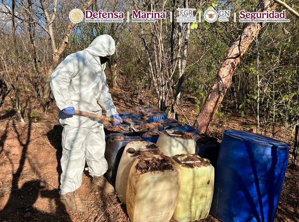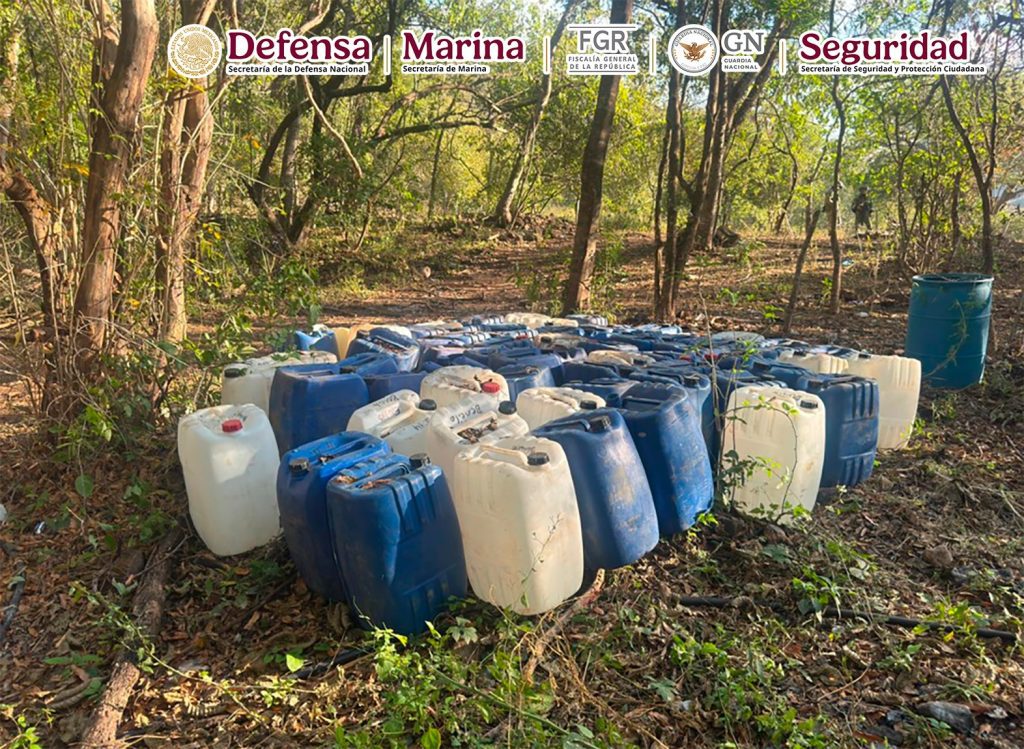 En otra acción, en Cosalá, Sinaloa, al realizar funciones de reconocimiento, se localizaron e inhabilitaron 11 áreas de concentración de material diverso para la elaboración de drogas sintéticas, se aseguraron 16,486 litros y 75 kilos de sustancias químicas.