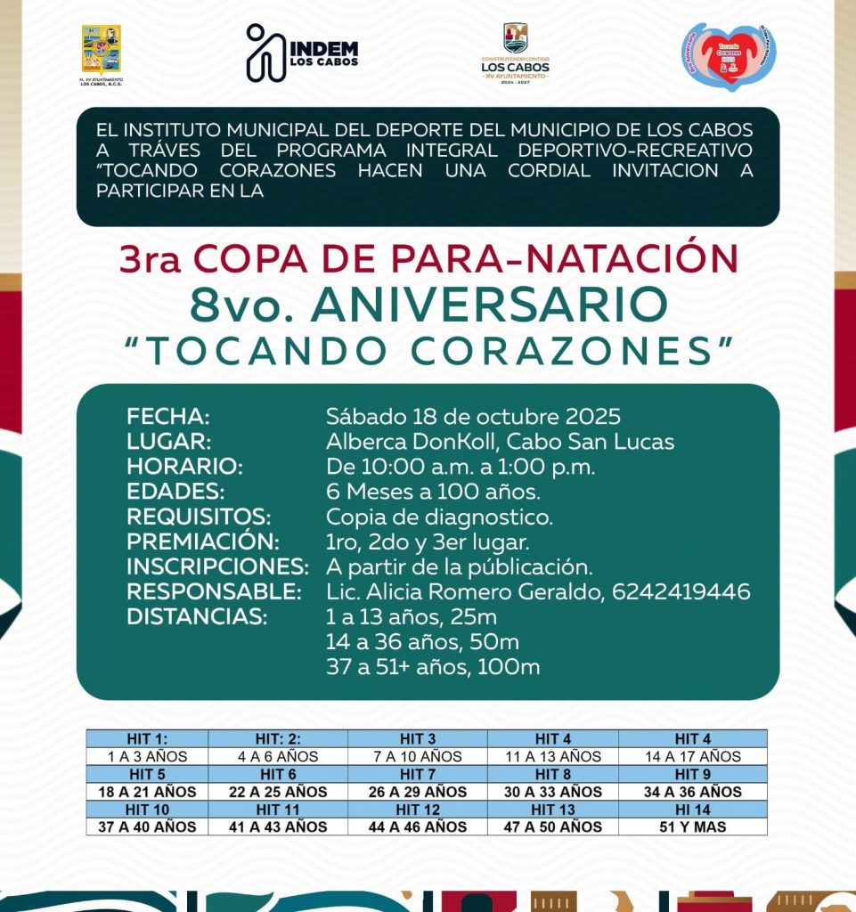 Los Cabos, Baja California Sur.- El Instituto del Deporte del Municipio de Los Cabos (INDEM), a través del programa integral deportivo-recreativo “Tocando Corazones”, anunció la realización de la tercera Copa de Paranatación, que tendrá lugar el sábado 18 de octubre en la alberca olímpica del complejo deportivo Don Koll, en Cabo San Lucas, en el marco del octavo aniversario de dicho programa.