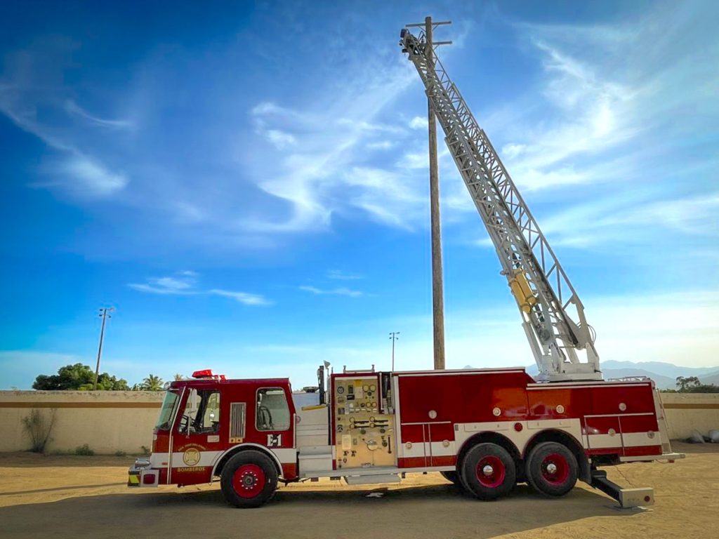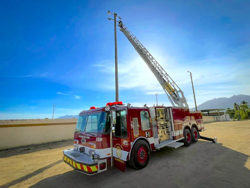 El camión escalera, con una longitud de 30 metros, es operado exclusivamente por personal especializado del Departamento de Bomberos de San José del Cabo, garantizando la seguridad de las cuadrillas que realizan los trabajos en altura.