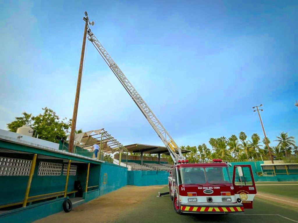 Los Cabos, Baja California Sur.– Con el propósito de reforzar los trabajos coordinados entre las áreas del XV Ayuntamiento de Los Cabos, el Departamento de Bomberos de San José del Cabo puso a disposición el camión escalera (ECO-01) para apoyar a la Dirección General de Servicios Públicos y al Instituto del Deporte del Municipio de Los Cabos (INDEM) en la rehabilitación de luminarias en centros deportivos de la zona norte del municipio. Estas acciones tienen un impacto directo en la ciudadanía de las delegaciones.