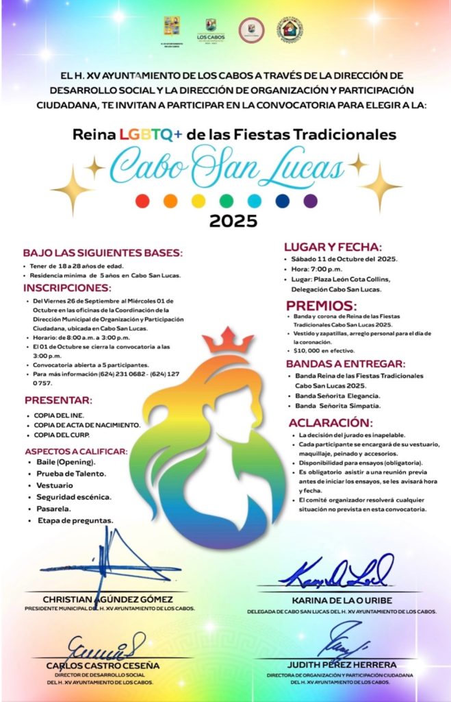 El XV Ayuntamiento de Los Cabos, a través de la Dirección General de Desarrollo Social y la Dirección Municipal de Organización y Participación Ciudadana, anunció de manera oficial las convocatorias para los certámenes que formarán parte de las Fiestas Tradicionales Cabo San Lucas 2025.
