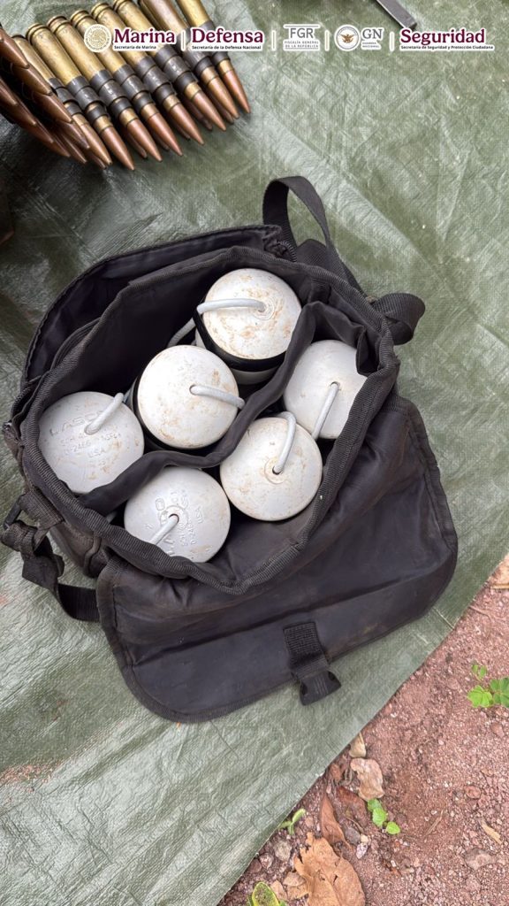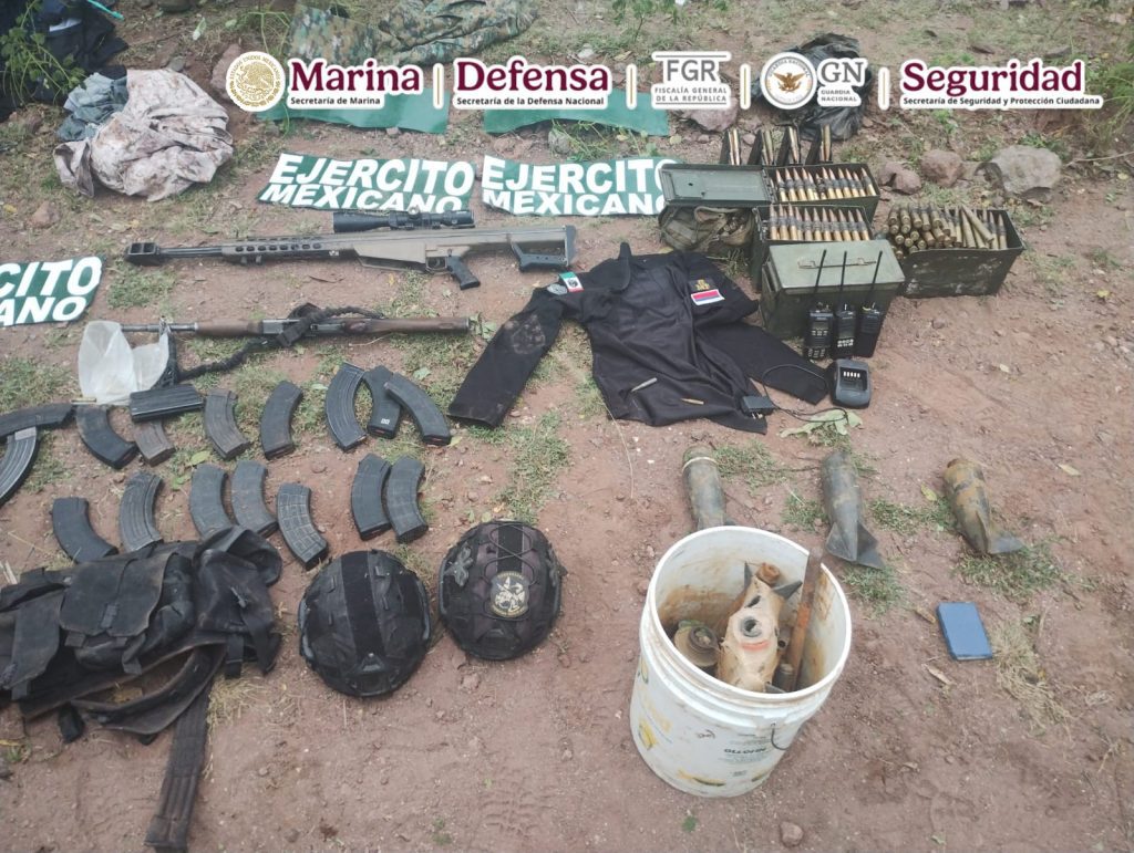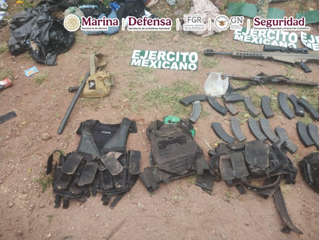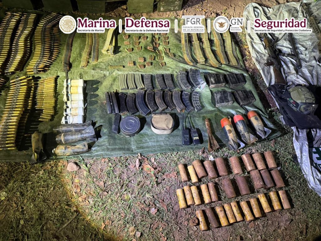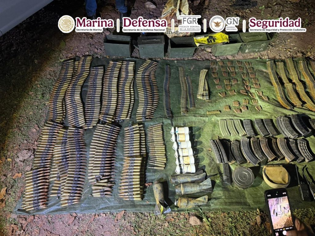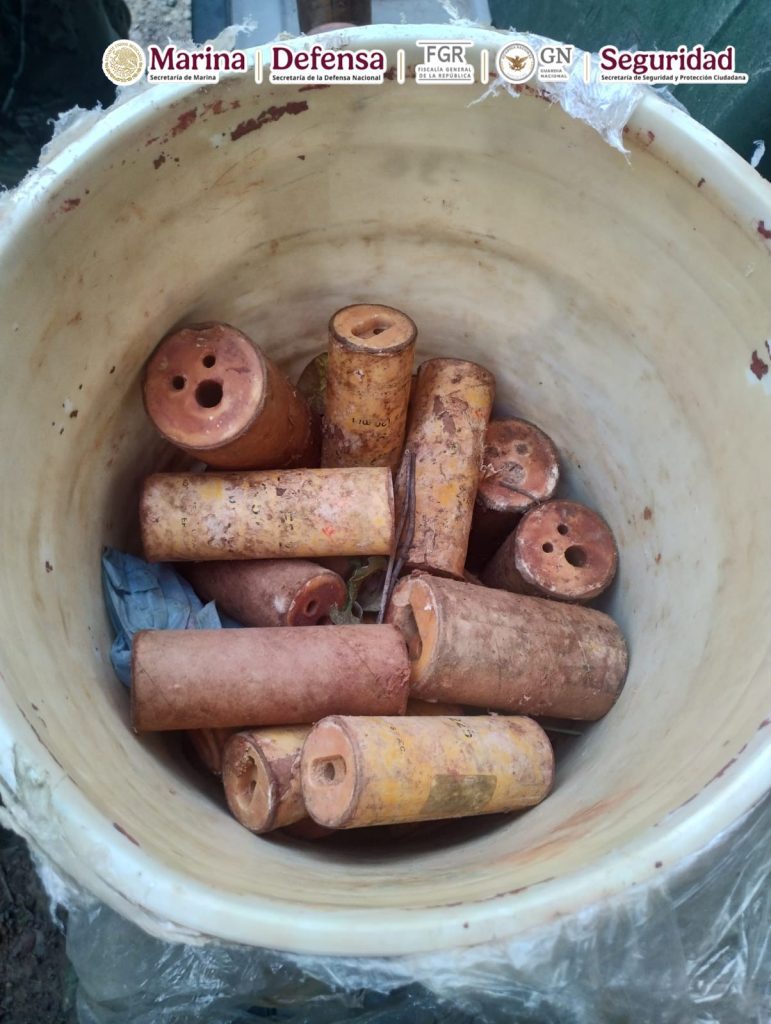 Ahí se hallaron tres armas largas, 1,770 cartuchos de diferentes calibres, 37 cargadores, un paquete con marihuana, un paquete con cocaína, cuatro camionetas con blindaje artesanal, entre los que se encontraba una unidad apócrifa de una institución de seguridad federal, 42 artefactos explosivos improvisados, dos radios, seis chalecos con placas, cuatro cascos y ropa táctica.