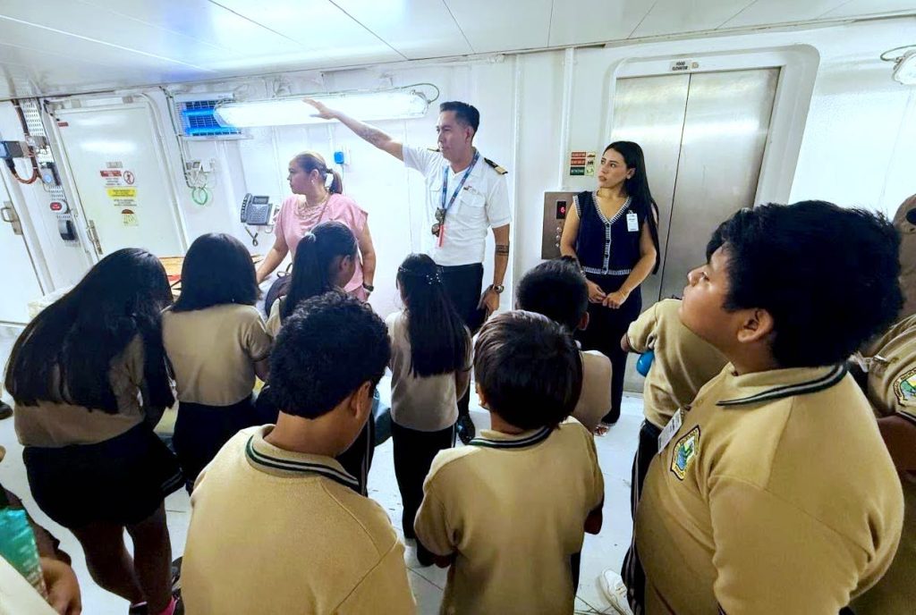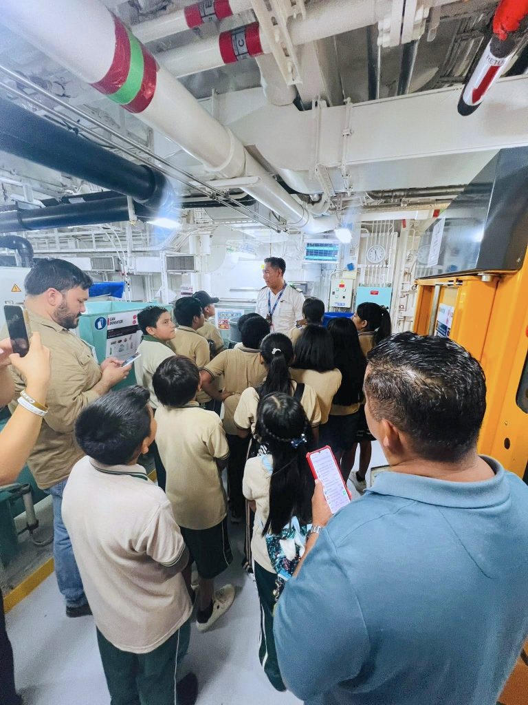 Durante el recorrido, las y los estudiantes tuvieron la oportunidad de conocer el funcionamiento interno del buque, en especial el área de reciclaje y manejo de residuos, donde recibieron una explicación sobre el tratamiento responsable de los desechos y la importancia del aprovechamiento de materiales orgánicos e inorgánicos; asimismo, pudieron observar el sistema biodigestivo con el que el crucero transforma los residuos alimenticios en agua reutilizable, mediante un proceso natural impulsado por bacterias.