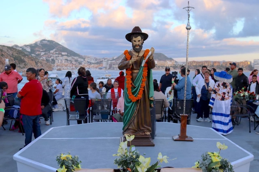 Posteriormente, se llevó a cabo el recorrido marítimo con la imagen de San Lucas Evangelista, tradición que año con año convoca a embarcaciones locales que acompañan al santo durante su travesía por la bahía. En el trayecto, las autoridades y fieles rindieron homenaje con una ofrenda floral frente al emblemático Arco de Cabo San Lucas, símbolo de unión e identidad para las y los habitantes del puerto.