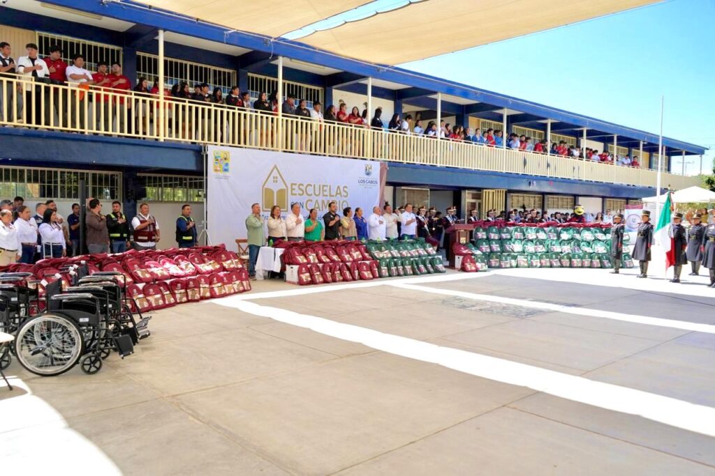 Los Cabos, Baja California Sur.– Con el propósito de fortalecer las condiciones educativas y brindar apoyo directo a la comunidad estudiantil, el presidente municipal de Los Cabos, Christian Agúndez Gómez, encabezó la entrega de $1 mil 100 mochilas escolares, 35 tablets destinadas a estudiantes con mayor rendimiento académico y sillas de ruedas, durante una visita al Centro de Bachillerato Tecnológico, Industrial y de Servicios (CBTIS) No. 256.