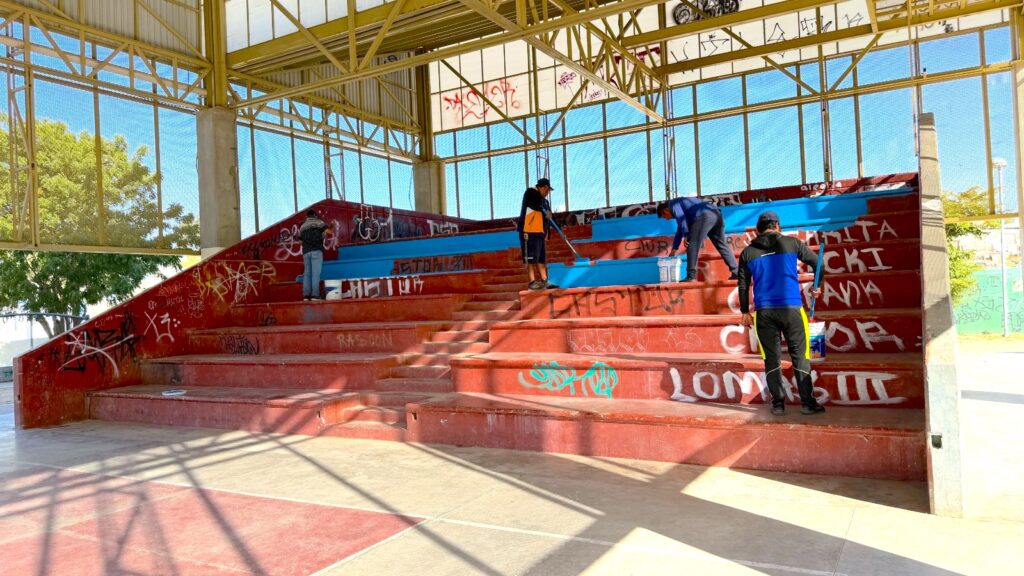 Los trabajos incluyeron la aplicación de pintura en la cancha de usos múltiples y en la barda perimetral, mantenimiento de los tableros de baloncesto, colocación de redes nuevas en los aros y la rehabilitación del sistema de alumbrado, con el fin de garantizar condiciones seguras para la práctica deportiva en horarios vespertinos.