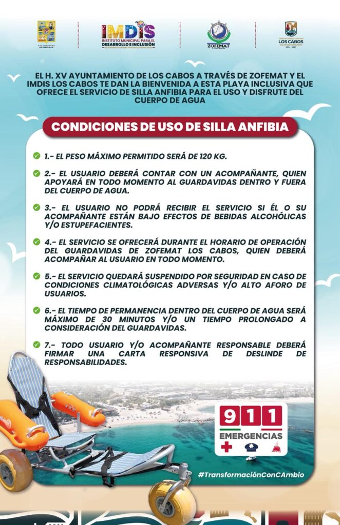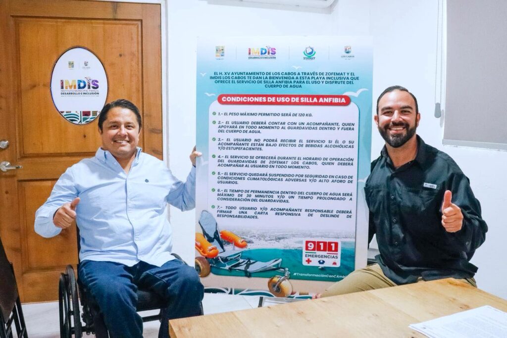 Los Cabos, Baja California Sur.– Con el objetivo de garantizar el acceso a las playas para todas las personas, el XV Ayuntamiento de Los Cabos que preside Christian Agúndez Gómez, implementó protocolos de atención y uso de sillas anfibias, en coordinación con el Instituto Municipal para el Desarrollo e Inclusión de Personas con Discapacidad (IMDIS) y la Zona Federal Marítimo Terrestre (Zofemat) a cargo de Rafael Guillermo Álvarez Munguía.