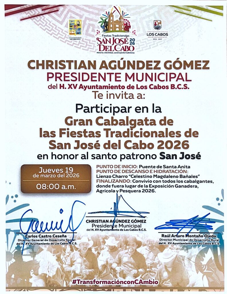 De manera paralela, también se abrió la convocatoria para participar en la elección de la Reina de los Cabalgantes 2026, dirigida a jóvenes de entre 16 y 23 años de edad que sean residentes de San José del Cabo con al menos cinco años comprobables.