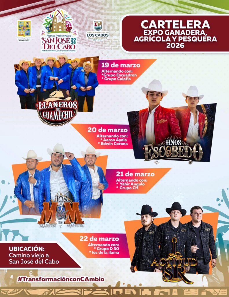El XV Ayuntamiento de Los Cabos y el Comité Organizador de las Fiestas Tradicionales San José del Cabo 2026 invitan a la ciudadanía a disfrutar de esta exposición, que forma parte de una de las celebraciones más representativas del municipio, promoviendo la cultura, la tradición y el desarrollo de los sectores productivos. Asimismo, se extiende la invitación para que esta noche asistan al Teatro del Pueblo y disfruten de la presentación del artista Edén Muñoz, así como de la participación de artistas locales, en un ambiente familiar y festivo.