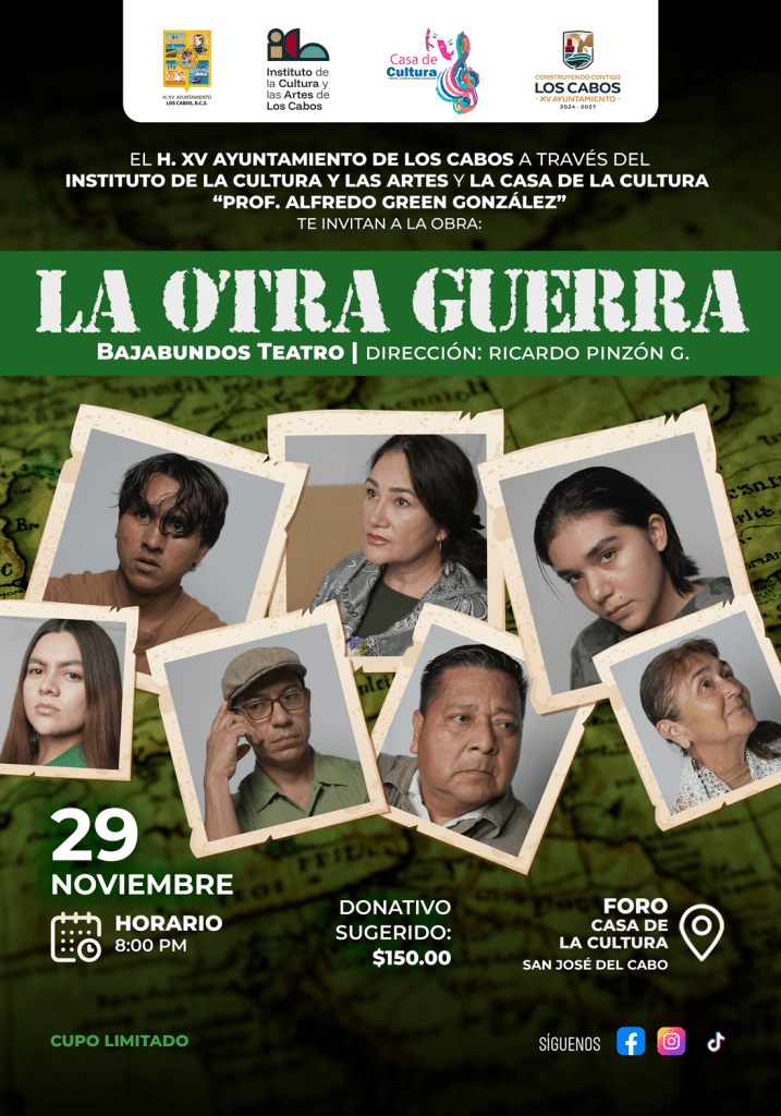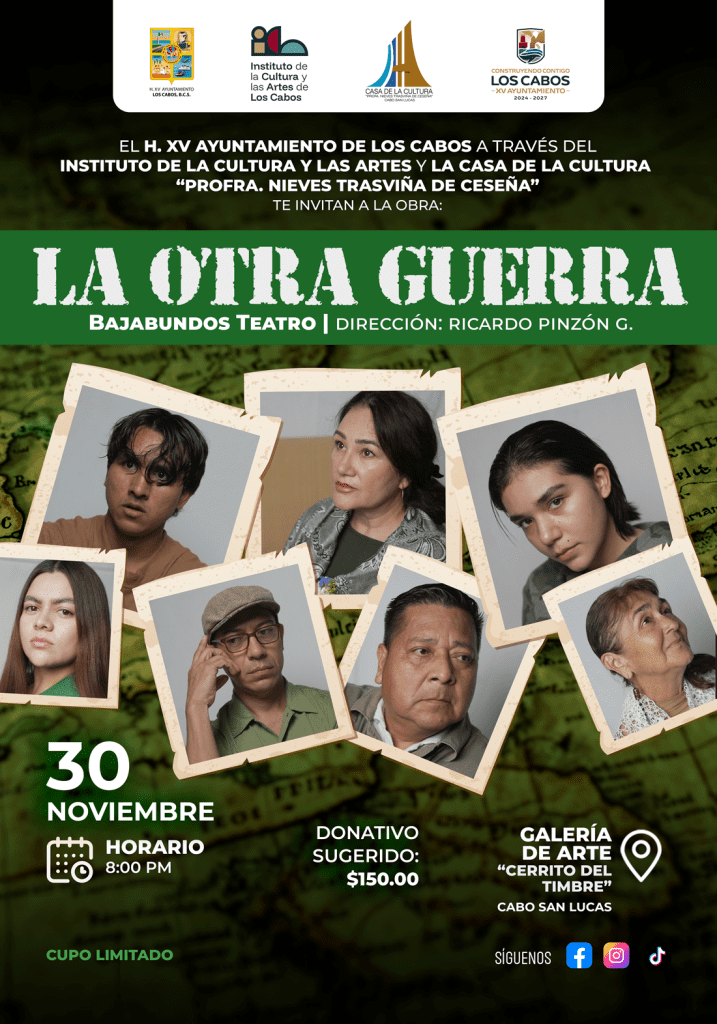 Los Cabos, Baja California Sur.– El H. XV Ayuntamiento de Los Cabos, a través del Instituto de la Cultura y las Artes, invita a la comunidad a disfrutar de dos funciones de la obra “La otra guerra”, puesta en escena por la compañía BajaBundos Teatro bajo la dirección de Ricardo Pinzón.