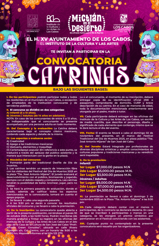 En San José del Cabo, las convocatorias estarán abiertas para los Concursos de Altares de Muertos —dirigido exclusivamente a preparatorias y universidades—, Catrinas y Pan de Muerto. En las delegaciones de Miraflores, Santiago y La Ribera, se desarrollarán las convocatorias de altares y catrinas, mientras que en Cabo San Lucas se llevará a cabo la participación especial de catrinas y catrines gigantes, una de las actividades más representativas del festival.