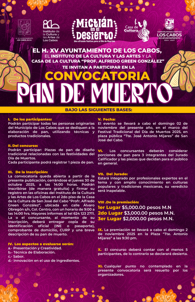 Los Cabos, Baja California Sur.– El XV Ayuntamiento de Los Cabos, a través del Instituto de la Cultura y las Artes (ICA), convoca a la comunidad a participar en las tradicionales actividades del Día de Muertos “Mictlán en el Desierto”, que este año busca fortalecer la identidad cultural, la creatividad y la unión comunitaria en todo el municipio.