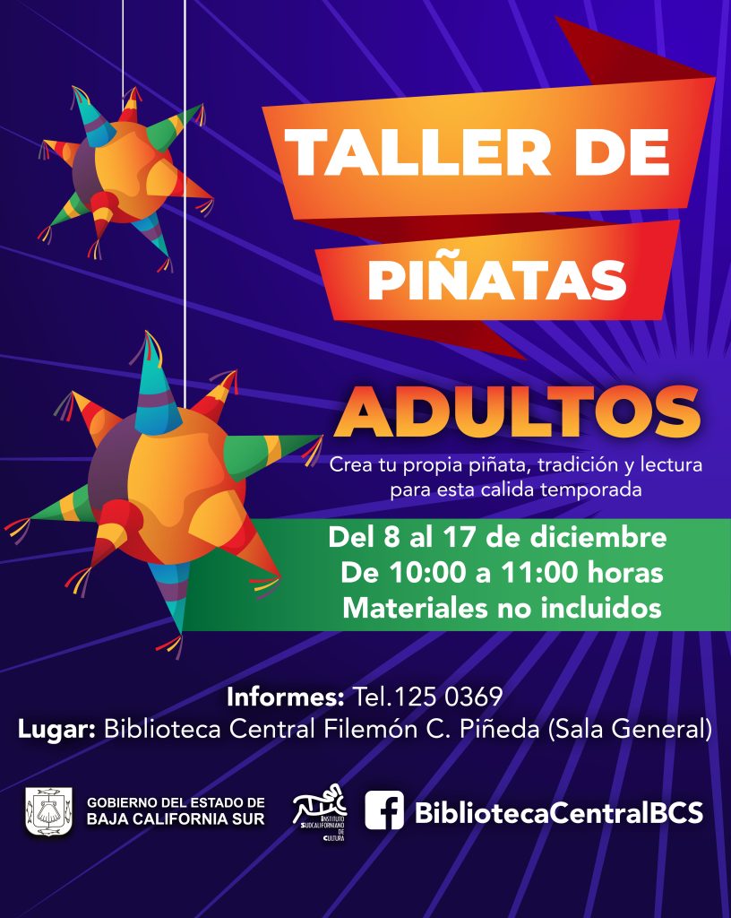 El Instituto Sudcaliforniano de Cultura (ISC) invita a niñas, niños, jóvenes y personas adultas a participar en un taller gratuito de elaboración de piñatas, que se llevará a cabo del 8 al 17 de diciembre, en un horario de 10:00 a 11:00 horas, en la Biblioteca Pública Central Filemón C. Piñeda.