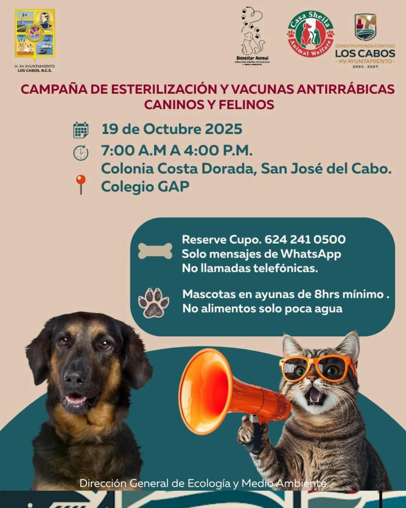 Los Cabos, Baja California Sur.- Con el objetivo de fomentar el cuidado y bienestar animal, el XV Ayuntamiento de Los Cabos que preside Christian Agúndez Gómez, a través de la Dirección General de Ecología y Medio Ambiente y en coordinación con Casa Sheila, invita a la ciudadanía a participar en la jornada de esterilización canina y felina que se llevará a cabo el sábado 19 de octubre en San José del Cabo.