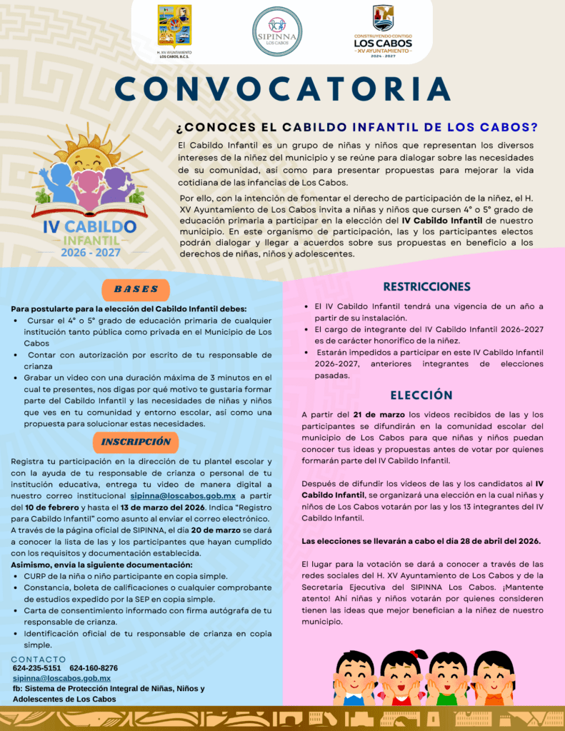 Los Cabos, Baja California Sur.– Con el objetivo de fomentar la participación cívica y acercar a las infancias al ejercicio de la vida pública, la Secretaría Ejecutiva del Sistema de Protección Integral de Niñas, Niños y Adolescentes (SIPINNA) de Los Cabos lanzó la convocatoria para participar en el IV Cabildo Infantil de Los Cabos, cuya elección se realizará el próximo 28 de abril de 2026.