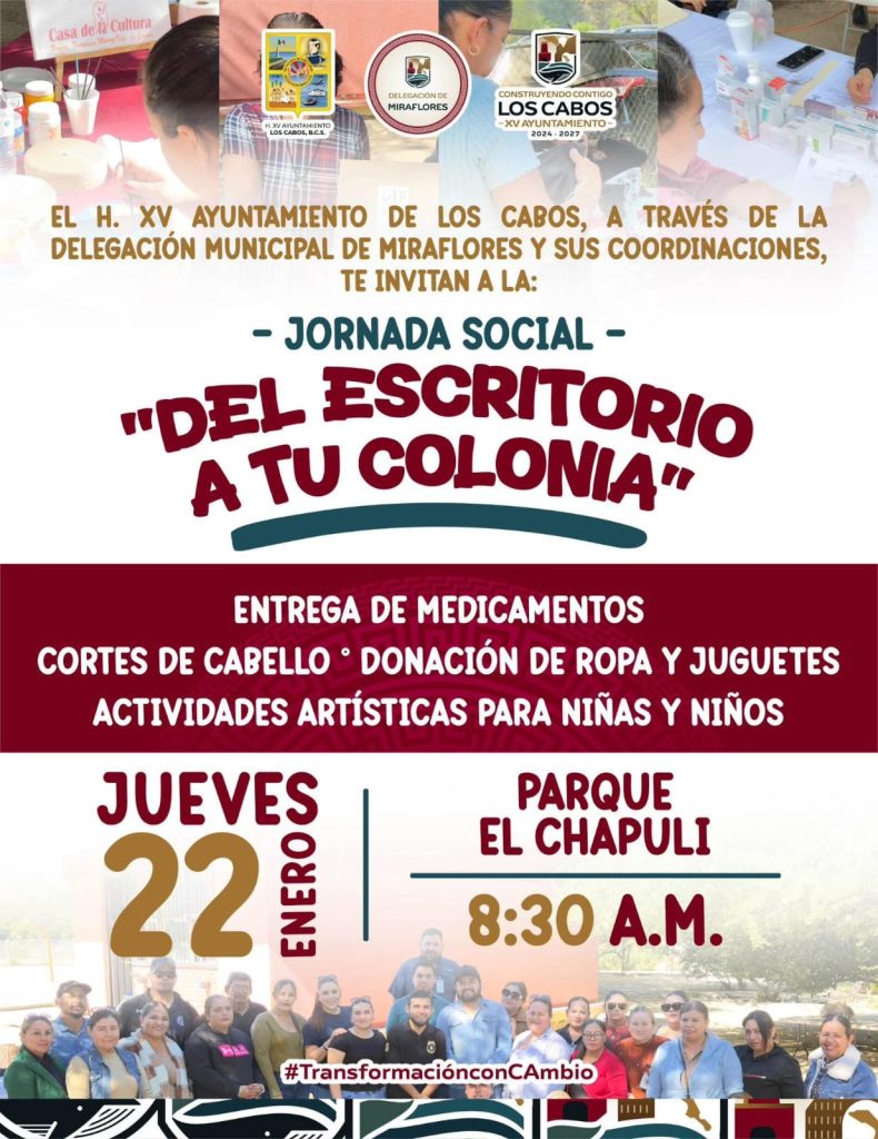 Los Cabos, Baja California Sur.– Como parte de las acciones para fortalecer la cercanía con la ciudadanía y garantizar el acceso a servicios municipales en zonas rurales, el XV Ayuntamiento de Los Cabos, a través de la Delegación Municipal de Miraflores, realizará este jueves 22 de enero una jornada social del programa “Del Escritorio a tu Colonia” en la comunidad de El Chapuli.