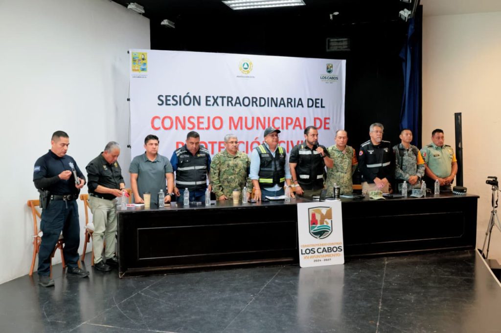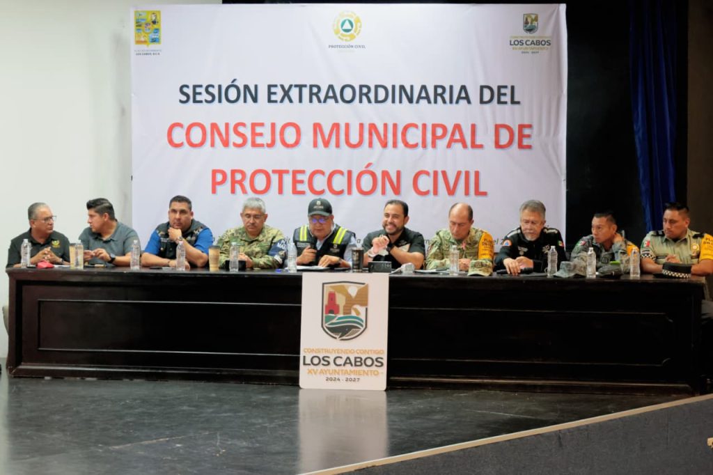 Los Cabos, Baja California Sur.– Con el objetivo de reforzar las acciones preventivas y salvaguardar a la población ante la cercanía de la tormenta tropical “Raymond”, sesionó el Consejo Municipal de Protección Civil, encabezado por el alcalde Christian Agúndez Gómez, con la presencia del Dr. Juan Manuel Arce Ortega como representante de la Coordinación Nacional de Proteción Civil.