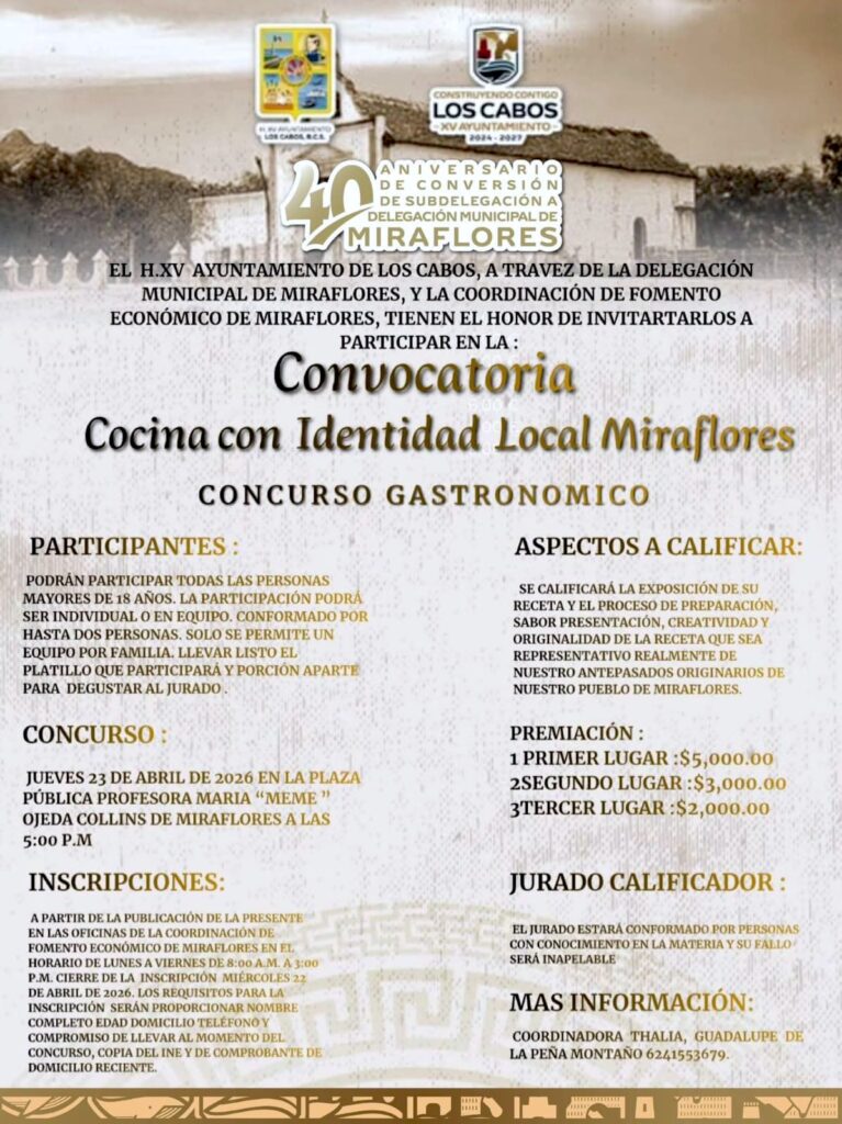 De igual manera, extendió una invitación a residentes y visitantes para sumarse a esta celebración, fortaleciendo el orgullo comunitario y preservando las costumbres que distinguen a Miraflores. Para mayores informes sobre convocatorias y actividades, la ciudadanía puede consultar las páginas oficiales de Facebook Delegación Municipal de Miraflores y Ayuntamiento de Los Cabos.