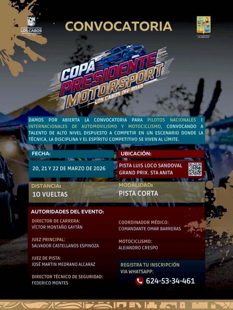 Finalmente, Montaño Gaytán destacó que este evento deportivo se realiza dentro del programa de las Fiestas Tradicionales de San José del Cabo 2026, fortaleciendo la promoción del deporte motor y la participación de competidores de distintos puntos del país y del extranjero.