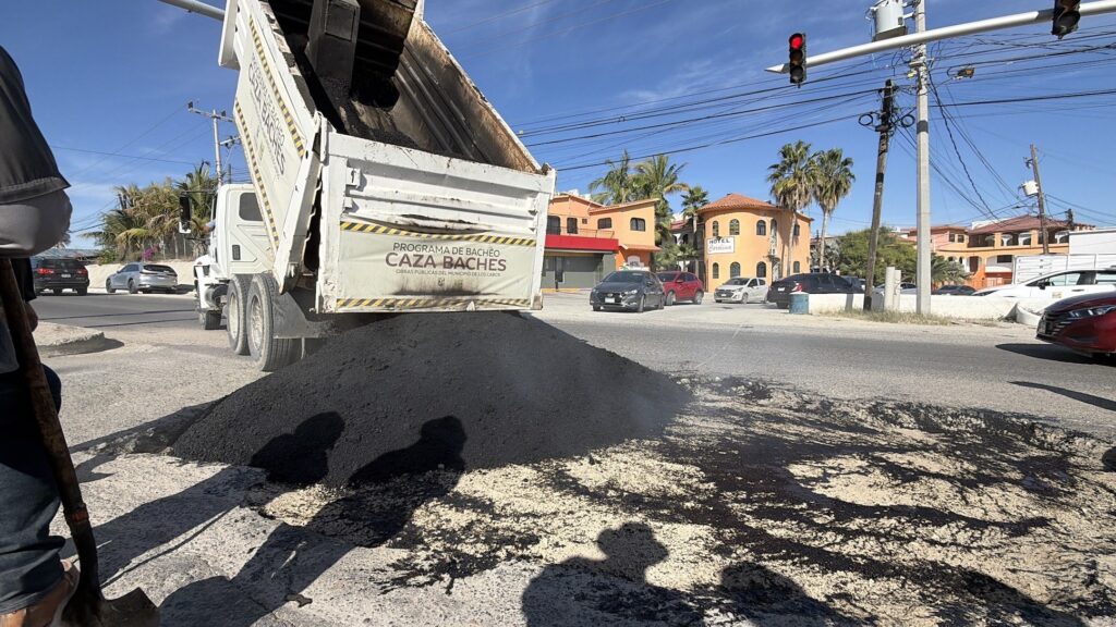 Los Cabos, Baja California Sur.– En atención a las instrucciones del presidente municipal de Los Cabos, Christian Agúndez Gómez, a través del equipo de la Dirección General de Obras Públicas y Asentamientos Humanos mantiene de manera permanente las acciones del programa Caza Baches, con trabajos focalizados actualmente en la colonia Guaymitas, sobre la carretera Transpeninsular en San José del Cabo.