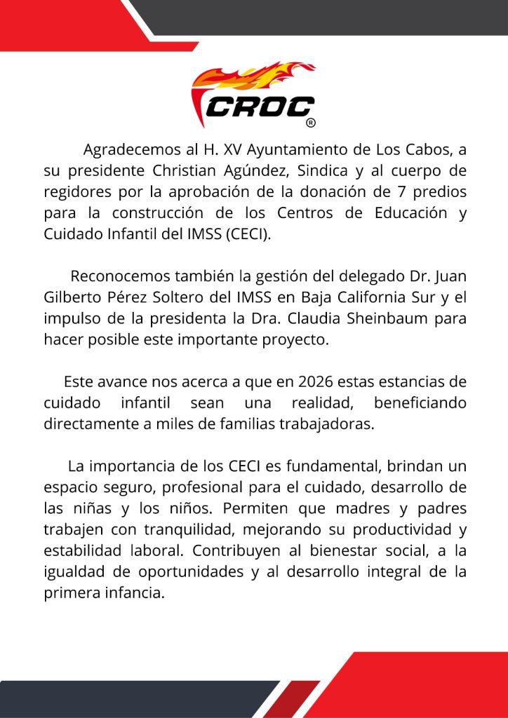 La Confederación Revolucionaria de Obreros y Campesinos (CROC) aplaudió la decisión del alcalde Christian Agúndez, de la Sindica e integrantes del H Cabildo de Los Cabos por la donación de 7 predios para la construcción de igual número de Centros de Educación y Cuidado Infantil del IMSS.
