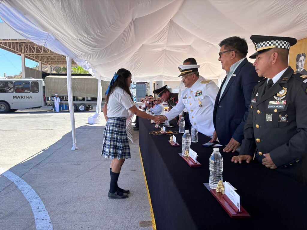 Asimismo, se recitó poesía en conmemoración al 112 Aniversario de la Gesta Heroica del 21 de abril de 1914 por parte de la alumna Melanny Edden Sánchez Ojeda en conjunto con la banda de guerra de la Escuela Telesecundaria No. 1 “José Agustín Olachea Avilés”, así como la ejecución de Salva de Honor por personal de Infantería de Marina, dejando un gran ejemplo a los marinos navales de lealtad inquebrantable hacia nuestro país.