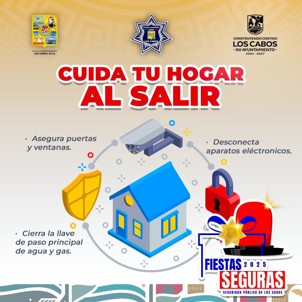 Los Cabos, Baja California Sur.- El XV Ayuntamiento de Los Cabos, a través de la Dirección General de Seguridad Pública, Policía Preventiva y Tránsito Municipal emitió un llamado a la ciudadanía para reforzar las medidas de prevención durante las festividades decembrinas, con el objetivo de salvaguardar la integridad de las familias y proteger su patrimonio.