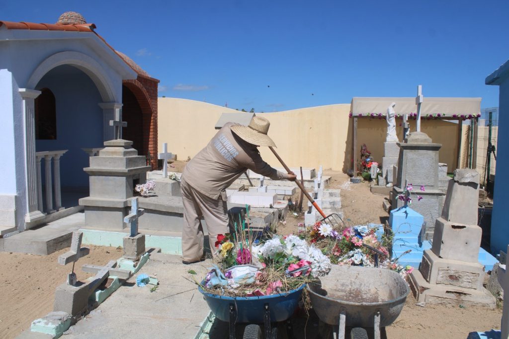 Jesús Germán Álvarez, encargado de los panteones en San José del Cabo, informó que estas acciones se realizan de manera permanente, no obstante, se intensifican en estas fechas por el incremento de visitantes que acuden a rendir homenaje a sus seres queridos: “estamos realizando labores de limpieza en las áreas frontales, laterales e interiores de los panteones para mantenerlos en óptimas condiciones. Invitamos a las familias a sumarse al cuidado de estos espacios y no olvidar a sus fieles difuntos”, expresó.