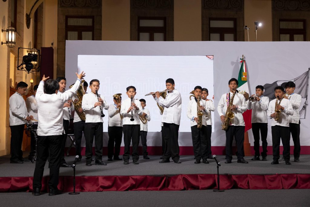 La Jefa del Ejecutivo Federal presenció la interpretación de niñas y niños de la Casa Escolar de la Niñez Indígena “Antrop. Alfonso Caso” de Cuautempan, Puebla (Grupo de Escritura en Lengua Náhuatl), quienes cantaron “Zi döni San Juan” (Flor de San Juan) en lengua Hñähñu y del Coro Comunitario Cantoría Salmantina de Salamanca, Guanajuato, que interpretó “Male Rosita” (Querida Rosita) en lengua P’urhépecha; así como de la Banda Comunitaria de Teotitlán del Valle, Oaxaca, que tocó variaciones de “Zandunga”.