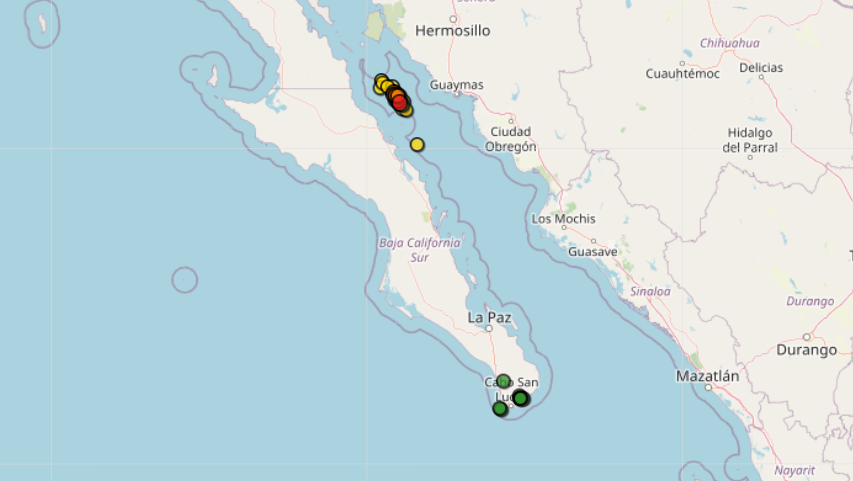 Santa Rosalía / La Paz, Baja California Sur. — La madrugada y la mañana de este viernes 7 de noviembre se registró una serie de sismos en el Golfo de California con epicentros próximos a Santa Rosalía, en la zona norte de Baja California Sur. El movimiento principal fue reportado con magnitud 5.7 y profundidad somera, lo que explicaría la percepción en tierra firme.