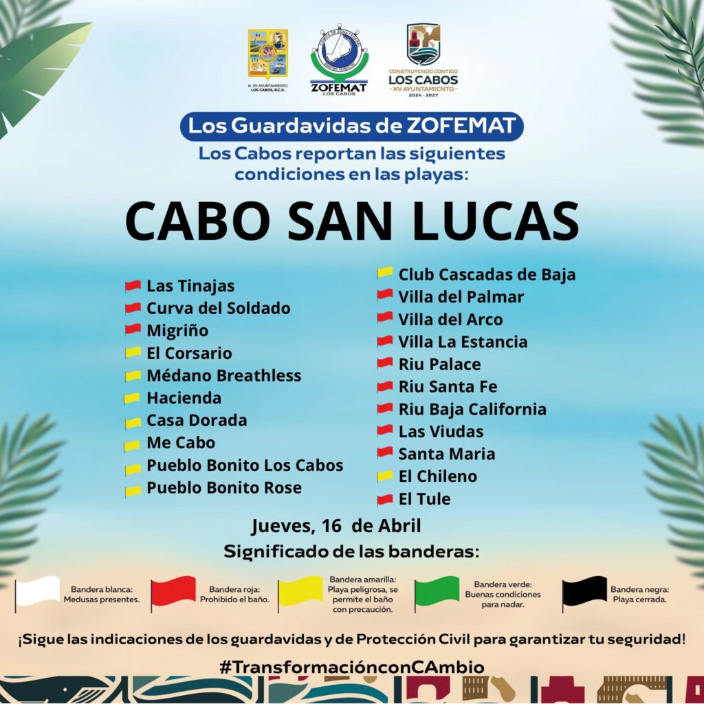 Asimismo, explicó que se mantiene personal capacitado en zonas de alta afluencia como Palmilla, El Chileno, El Médano y Migriño, donde se realiza la actualización constante del sistema de banderas conforme cambian las condiciones marítimas.